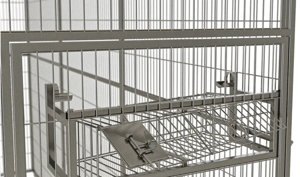 Viveiro modular de 3x1x2m, arame BTC 2,7mm, com comedouro giratório, ideal para manejo seguro de psitacídeos grandes com mínimo risco de fuga.